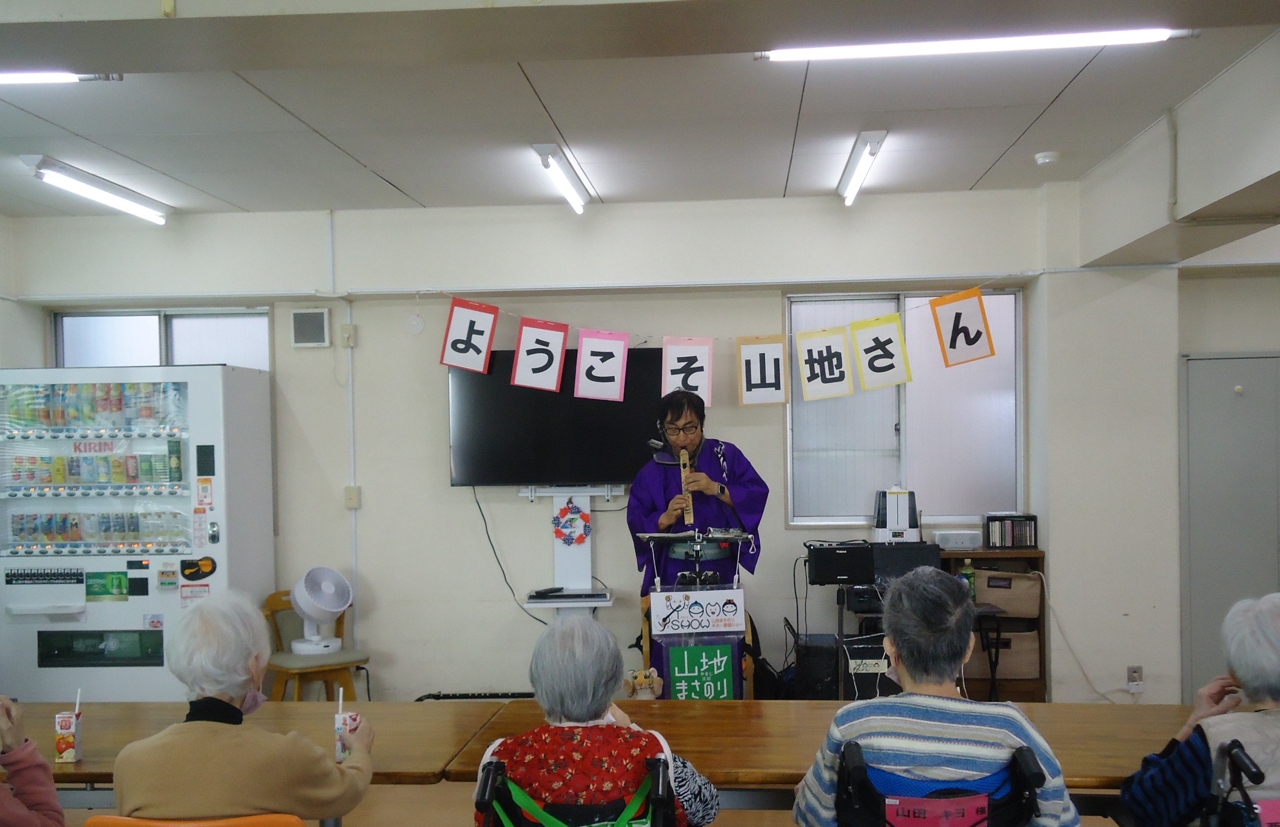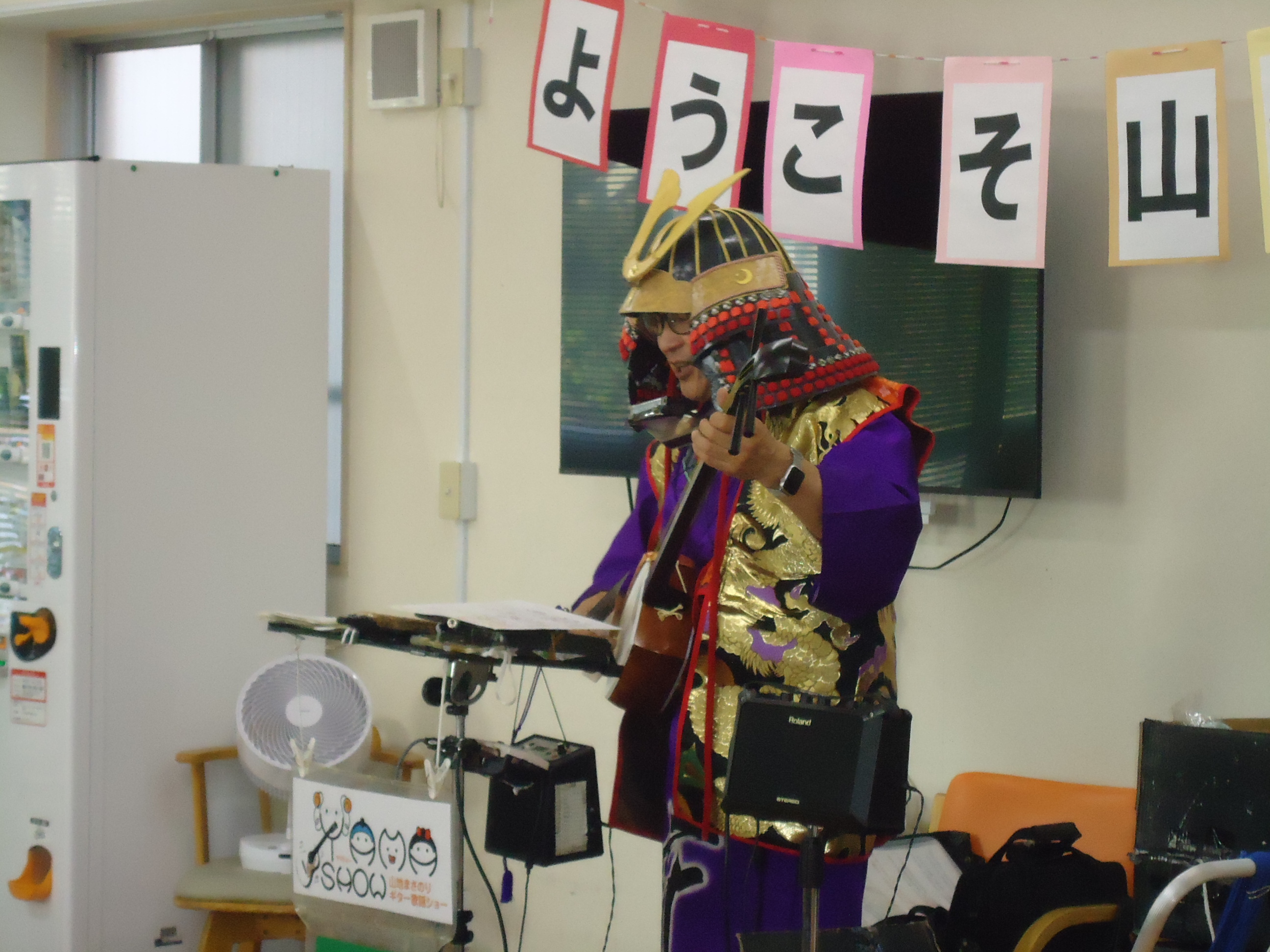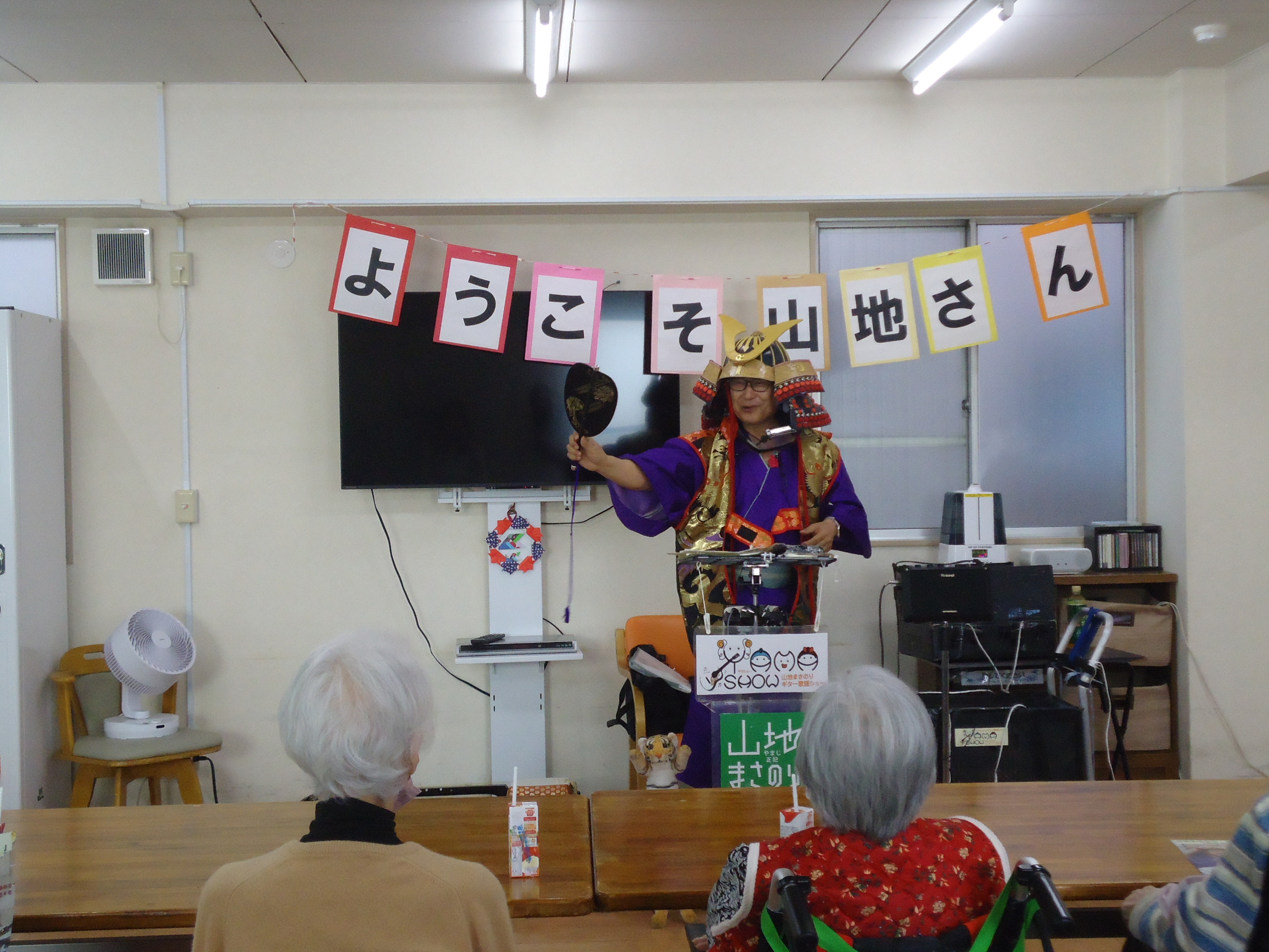 今年2回目 山地さんギターショー 2026/4/19 新緑まぶしい季節となりました。 今年2回目となる山地さんのギターショー!なんだかパワーアップしています。 何がパワーアップしているでしょうか? そう、和装・三味線・戦国武将です。トークも炸裂でした。 今回も歌い、体を動かし、笑い、と楽しいひと時を過ごしました。 4月お誕生日の方のお祝いもしていただきました♪ またお越しください! お問い合わせフォームはこちら